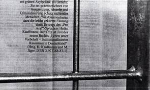 „Spricht nicht der in Deutschland latente Fremdenhass, bürokratisch verklausuliert, aus der Abschiebepraxis des gegenwärtigen Innenministers, dessen Härte bei rechtsradikalen Schlägerkolonnen ihr Echo findet? Über 4000 Flüchtlinge aus der Türkei, Algerien, Nigeria, denen nichts kriminelles nachgewiesen werden kann, sitzen in Abschiebelagern hinter Schloss und Riegel, Schüblinge werden sie auf Neudeutsch genannt – es ist wohl so, dass wir alle untätige Zeugen einer abermaligen, diesmal demokratisch abgesicherten Barbarei sind.“